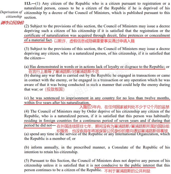 塞浦路斯政府并没有透露原因,但有下面几种情况的,可以撤销已经入籍人士的国籍。以欺诈,提供虚假信息或隐瞒重要事实的方式通过申请(比如隐瞒犯罪记录);在言行上羞辱塞浦路斯/对塞浦路斯不忠;入籍后5年内,在任何国家被判处不少于12个月的监禁;在外国习惯性连续居住七年,期间没有为塞浦路斯/塞浦路斯所属的任何国际组织服务,也没有每年向塞浦路斯告知其保留公民身份的意向;不利于塞浦路斯的公共利益。